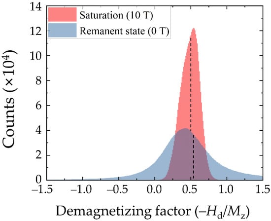 The demagnetizing factor (N = −Hd/Mz) is a geometry-dependent value representing the magnet, which refers to the proportionality of the demagnetizing field with the magnetization []. To clearly show the mismatch between the magnetization and the demagnetizing field, the demagnetizing factor of each cell was investigated; a histogram for the distribution of the demagnetizing factor is given in Figure 5. In the saturation state, the demagnetizing factor is affected by the distribution of the demagnetizing field and follows a narrow Gaussian distribution because the magnetizations in the magnet are aligned along the applied field direction. On the other hand, in the case of the remanent state, the demagnetizing factor spreads over a wide range due to the mismatch between the magnetizations and the demagnetizing fields.