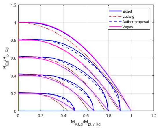 HEB 200. Comparison of the exact curves obtained by linear programming with: (i) the results of authors (Table 1 below, Equation (37)); (ii) the results of Vayas []; (iii) and the results of Ludwig []. The parameters of the curves from top to bottom are Mz,Ed/Mpl.z.Rd = 0; 0.2; 0.4; 0.6; 0.8.
