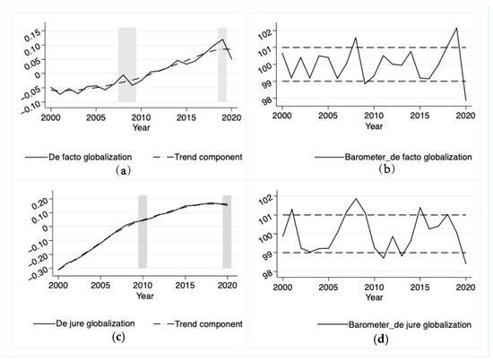 Figure 2 shows the de facto and de jure Globalization Barometer, as well as the trend components. In terms of de facto globalization, the trend term is generally upward. During the past two decades, two global events, i.e., the 2008 financial crisis and the COVID-19 outbreak in 2020, influenced its progress, as shown by the grey areas. The financial crisis in 2008 caused a significant dip in de facto globalization. The de facto Globalization Barometer soared to 101.58 on the eve of the 2008 crisis, and then fell to the bottom of 98.84 when the crisis started to spread, turning from “above trend” to “below trend”. Since then, de facto globalization resumed its positive development until the pandemic hit the world in 2020, when de facto globalization suffered an even greater fluctuation. As shown in Figure 2b, a significant “above trend” could be observed in 2019, before a sharp drop to “below trend” in 2020, when the pandemic began to exert its negative influence on the world economy as well as other aspects of human lives. Moreover, the pandemic even caused the trend component to decrease. This is partly a reflection of the fragility and relative instability of globalization, where global events at the economic, social or political level could destabilize the level of de facto globalization. Overall, however, a positive trend is evident in de facto globalization.