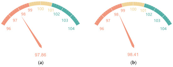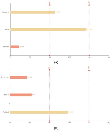 Drawing on the idea of the Global Trade Barometer of WTO [28], this paper compiles the Globalization Barometer with de facto and de jure dimensions. The steps are as follows: First, the HP filter is applied to the Globalization Index measured in Section 2, and the trend term is extracted; next, the index value is subtracted from the trend term to obtain the deviation term; finally, the deviation term is normalized and added by 100, and compared against the barometer standard interval. The standard barometer interval is set by taking 100 as the baseline, and the intervals (99, 101), (101, +∞), and (−∞, 99) are defined as “in trend” (yellow), “above trend” (green), and “below trend” (red), respectively.