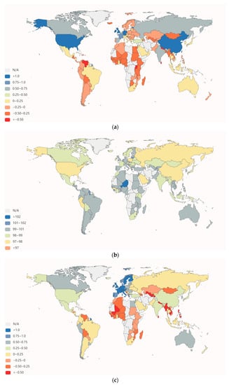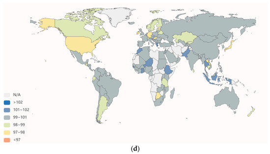 Second, let us focus on the de jure globalization and its barometer in 2020. From Figure 4c,d, we can observe: