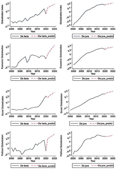 Following Petukhova et al. [41], we use the Random Forest model to predict the time-series data. The de facto and de jure globalization, as well as the economic, social, and political dimensions, for the subsequent 5 years after 2020 are predicted and analyzed in this section.