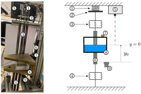 Snapshot of the experimental setup for the scale (left) and outline (right). (1) Load cell, (2) metallic plate with mass kg, (3) upper set of springs with stiffness constant N/m, (4) lower set of springs with stiffness constant N/m, (5) laser sensor, (6) mechanical guide, (7) accelerometer, (8) methacrylate tank and C-shaped wooden structure and (9) pair of solenoids acting as release mechanism.