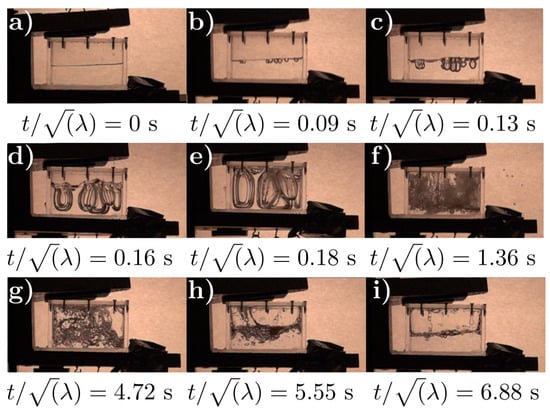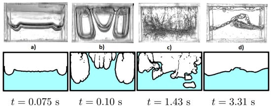 - As displayed in Figure 5, during the first instants, a ripple generated from the free surface deformation due to the initial meniscus travels horizontally through the free surface from the lateral walls toward the tank center; see a snapshot of this traveling wave in Figure 5a ( s). This initial stage can be interpreted as a classical evolution of a Rayleigh–Taylor instability. This initial stage finishes with the first fluid–wall impact; see Figure 5b ( s). In this instant, a four-jet symmetrical image is observed, where two central jets impact the tank ceiling while the other two after traveling up the lateral walls impact at the lateral-top corners.