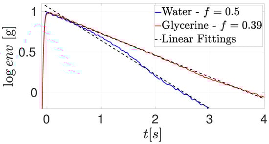Logarithm of the envelope function and performed linear fitting for water and glycerine tests at and , respectively; and .
