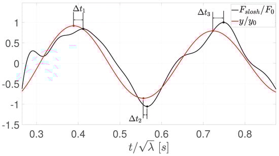 The phase-shift is defined as the angle related to the time-shift between the vertical sloshing force peaks and tank position peaks y. The first 3 time-shifts are shown in Figure 4 for a water test at 50% fill level and g.