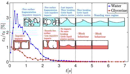 In this subsection, the different stages of the flow from both points of view, numerical and experimental, are compared in order to observe the common characteristics. First, the case of water will be described, and then that of the glycerine in order to remark on the clear differences between both cases. Prior to this work, in [], the fact that the extra damping added by the fluid depends on the Reynolds number only when it is below a critical Reynolds value was observed. Denoting the characteristic Reynolds number for the water and glycerine cases as and , respectively, this critical Reynolds number is approximately an order of magnitude lower than the case of water . Consequently, the Reynolds numbers of the water and the glycerine are placed at two different sloshing regimes .