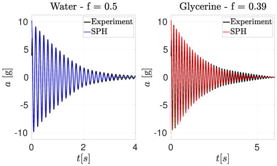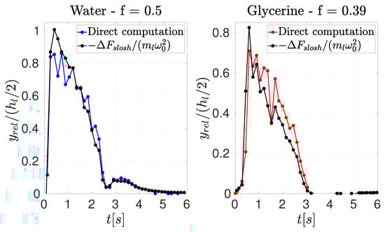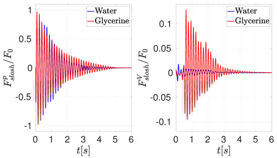 The sloshing force is measured experimentally according to Expression (4) and computed numerically according to Expression (20). Both forces have been accurately compared as part of the code validation in [,]. The advantage of the computational methodology is among others that the pressure and viscous contributions can be obtained separately. To understand the contributions of these two sloshing force sources, two cases corresponding to two different fluids, water and glycerine, have been studied with the same initial acceleration , same scale and same mass ratio . As these two fluids have different densities, the initial filling level is different for these two cases, ( for water) and ( for glycerine), in order to keep the mass ratio constant. These two fluids, water and glycerine, have the properties shown in Table 1. As Table 1 shows, the flows studied have very different Reynolds numbers, which implies a laminar regime in the case of glycerine and a fully turbulent flow for the water. This difference in terms of Reynolds numbers is mainly caused by the large difference in terms of viscosity, and consequently significant differences in the flow behavior and force decomposition between the pressure and viscous parts are observed.