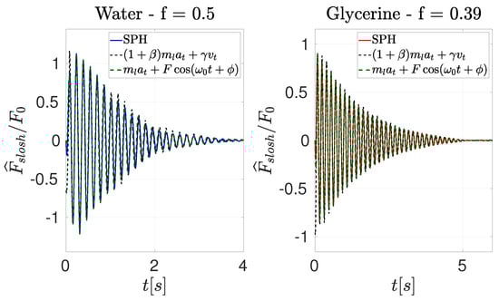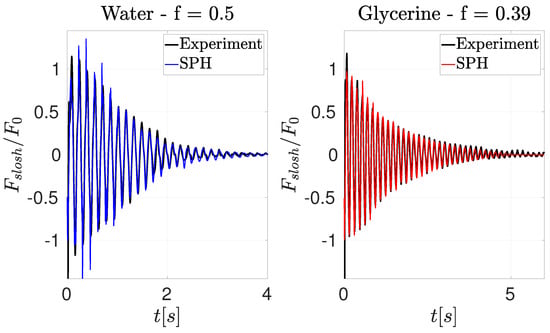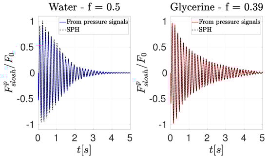 where is the area associated to each sensor, b is the tank dimension in the transverse direction and n the number of sensors. The force computed from the pressure signals multiplied by the corresponding associated wall areas of all sensors are added (see Equation (28)), and the result is compared to the pressure component of the sloshing force computed by the SPH formulation; see Equation (20). These two signals are both plotted in Figure 21 for the water and glycerine fluids, the agreement between both signals being very good for both cases. It should be clarified that the liquid weight has been removed from both signals and consequently, all forces tend to zero at the end of the computation. The differences are caused by numerical error due to the limited number of sensors.