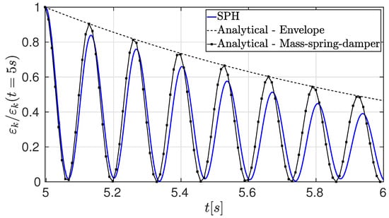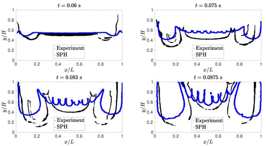 A very detailed study on the initial stages of this sloshing problem where the Rayleigh–Taylor instability alters the free surface is performed in []. Normally, the Rayleigh–Taylor instability (RTI) appears when the density gradient due to the presence of different fluids and gravity is opposed. This situation is present at the initial stages of our problem, when the two different fluids are confined and the tank is accelerated upwards. In our case, the light fluid overlies a heavier fluid by the action of gravity, but the RTI is developed when a larger acceleration than gravity is applied to both fluids in the direction opposite to the force of gravity. As explained before, the density gradient is opposed to the difference between the inertial force and gravity. In order to understand what is causing the initial free surface deformation, the Rayleigh–Taylor instability can be studied comparing the results from the SPH simulations and other results obtained when the Navier–Stokes equations are perturbed and linearized; see []. Very few SPH approaches [,] contain a detailed quantitative comparison to other classical numerical formulations where well-established results such as the growth rate of the linear parts of the RTI are monitored.