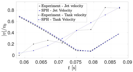 As is also discussed by [], the presence of solid walls have an influence on the computation of the free surface particles and their associated normal value. In order to have a proper definition of these, eigenvalues at the boundary need to be taken into account in Equation (16). However, this is not the case when computing shifting velocities from Equation (13), in which the extension at the boundaries is not considered. Taking into account these details, tips and jets are correctly identified and the simulations remain stable.