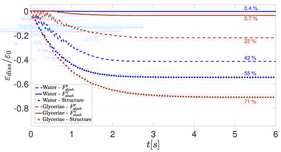 The energy dissipated by the different physical components of the sloshing force can also be studied, where and denote the pressure and viscous parts, respectively, and also considering the dissipated energy given by the structural damping force . These energies are computed using the Expression (27) and then normalized by .