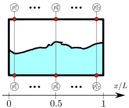 In this subsection, the possibility of reconstructing the pressure contribution of the sloshing force as a sum of a discrete number of pressure sensors multiplied by their corresponding areas is explored. This computation is important to test the accuracy of the pressure fields computed by the SPH formulation, which will be compared in future work with the measurements given by the experimental pressure sensors; see [] as an example of these sensors used in sloshing experiments. This fact reveals that the sloshing force is in first approximation caused by a succession of impact pressures. In Figure 18, a scheme is shown where 34 pressure sensors are used—17 on the top wall and 17 on the bottom wall . The pressure signal is computed by a smoothed interpolation using the particles which are within a smoothing length distance h from the sensor position.