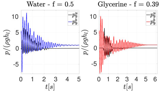 In Figure 19, the top and bottom pressure signals obtained from the middle sensor 9 are plotted as a function of time for both the water and glycerine. The pressure signals presented in this section have been filtered around the natural frequency of the experiment using a fourth-order Butterworth filter. The pressure values have been normalized with the hydrostatic pressure value at the tank bottom where represents the liquid height. In both glycerine and water cases, the bottom pressures are larger than the upper values largely due to the weight contribution. It was also observed that at the end of the simulation, the sensor value tends toward zero in the upper case and toward the final hydrostatic value for the bottom case. Focusing on the glycerine, it was observed that the upper signal starts close to the first impact s and finishes quickly, approximately 2 s later. This is because the glycerine impacts with the upper wall finishing at s. The rest of the upper signal is nearly zero as the glycerine behaves similarly to a standing wave confined at the bottom of the tank, something clearly shown by the bottom signal. Additionally, Figure 20 displays the map of the nondimensional pressure maxima extracted from the 34 pressure signals over time and the normalized coordinate. In this figure, it can be observed that the impacts against the upper wall are mostly localized to the middle region of the tank presenting maximum nondimensional pressures of 8.66 and 6.84 for water and glycerine, respectively. The pressure impacts against the upper wall for the glycerine are less intense and frequent when compared to the water, which could be related to the fact that the glycerine test case presents less liquid-induced dissipation as indicated in Table 2. When looking at the pressure maps for the bottom wall presented in Figure 20, higher pressure maxima than the ones registered for the upper wall with a maximum pressure of 10.63 and 9.9 for water and glycerine, respectively, are observed. The pressure impacts against the bottom wall are larger than the ones registered for the upper wall due to the influence of the liquid’s weight. The decay rate of the pressure maxima appears to be higher for the glycerine case, indicating that the pressure impacts and the violent regime of the flow last for shorter times. This observation is backed up by Figure 7.