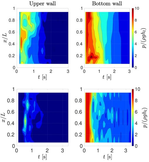 Nondimensional pressure maxima as a function of time and x coordinate for the upper (left) and bottom wall (right) in the water case at (top) and glycerine case at (bottom). The contour plot has been interpolated using 17 pressure signals for each wall.