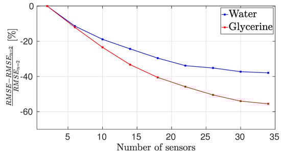 where N is the number of time steps recorded. Figure 22 shows the evolution of the relative difference between the values using n sensors with respect to the case where only two sensors are used. It can be observed that the water tends toward a constant value of ∼−39%, meaning that when using more than 30 sensors, the level of approximation is reasonable. In the case of the glycerine, the convergence is not so evident, and even when using 34 sensors the force still has some small variations.