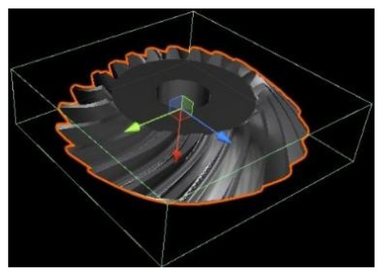 The arc feature can be decomposed into a mesh solid model composed of a finite number of trapezoidal elements. The gear features can be decomposed into finite tooth section elements along the axial direction to fit the gear features of helical, spiral, and conical teeth. The bright green wireframe in the following figures represents the bounding box of the part. Figure 9a is the 3D model; Figure 9b shows the built-in mesh trigger without physical simulation and collision trigger detection function; Figure 9c is the mesh solid model constructed in this paper, including the gear feature and arc feature of the inner hole.