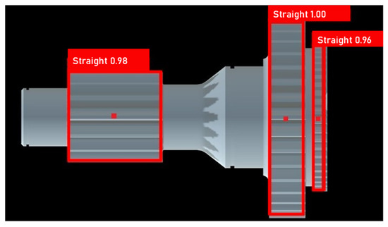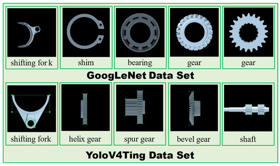 In this study, GoogLeNet is used to classify the parts corresponding to the image according to the sample image of the part; YoloV4Tiny is used to detect all part features in the sample image according to the type of features contained in the part. Their dataset is classified according to the types of parts and their characteristics summarized in Table 1. There are about 1500 samples of each type of parts. The training set, test set, and verification set are divided according to the quantity ratio of 8:1:1 to construct the data set of GoogLeNet image classification network. This data set, according to the relationship between parts and their feature types summarized in Table 1, frames the data features in various parts’ image samples, and constructs the data set of YoloV4Tiny. The schematic diagram of the data set is shown in Figure 13. Their recognition and detection accuracies are both higher than 99.6%. In this study, approximately 10,000 three-dimensional models are used to construct its training set. Some of its data and the PR curve of network training are as shown in Table 3 and Figure 13 and Figure 14.