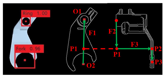 - Process of detecting the shift fork: The image-processing algorithm obtains the positions of the shift fork ring and the shift fork shaft hole from the deep-learning target detection network and obtains the fork ring attachment point P1. P2 is triggered by the movement of the detection ball along the axis of the shift fork hole, and P3 is triggered by the movement along F2 again and solves the radius and relative position of the fork ring (see Figure 7).