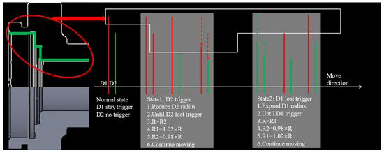- Process of detecting inner contour feature segments: The system controls the two detection discs, D1 and D2, to move along the rotation axis direction (the direction of the white arrow in the Figure 8) from the left end face of the part. The inner diameter of the characteristic section is detected by detecting the trigger state changes of D1 and D2. The inner contour step can be summarized into two states: state1 and state2. After D1 and D2 move to the right end face, the internal spline features are determined according to the detection process of the number of teeth (Figure 6a).