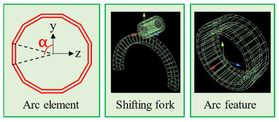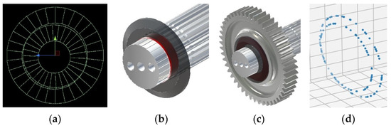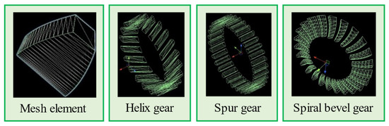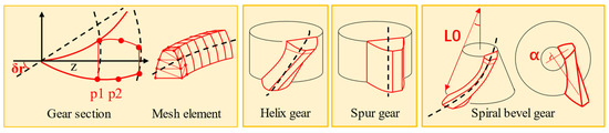 First, the algorithm divides the rolling angle range into finite values according to the accuracy and obtains the corresponding points on the involute; among them, is the rolling angle corresponding to the intersection P2 of the addendum circle and the involute, and is the rolling angle corresponding to the intersection P1 of the base circle and the involute. Then, the involute rotates around the origin radians, mirrors clone along the z-axis to obtain all differential contour points of the gear section and translates and clones the gear section points on the back to construct the mesh element (see gear section and mesh element). In Formula (12), is the module of the spur gear and helical gear and the module of the large end of the spiral bevel gear; is the number of teeth of the gear; and are the Y and Z coordinates of the intersection of the dividing circle and the involute. are the width of the gear and the division accuracy of the tooth line, respectively. When the gear is a cylindrical spur gear, each mesh element is arranged along the axial direction (see spur gear in Figure 10). When the gear is a cylindrical helical gear or a bevel gear, each mesh element with a thickness of is arranged along the helix or spiral direction (see the black dotted line in helix gear and spiral bevel gear) to form the mesh solid model of a single gear tooth. Finally, the mesh solid model of a single gear tooth is cloned times, and each clone rotates radians around the rotation axis of the part to construct the mesh solid model of gear features (see helix gear and spiral bevel gear in Figure 11).