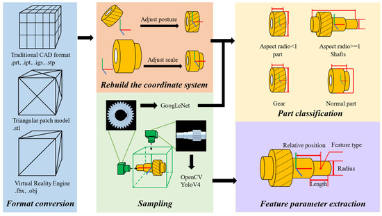 The architecture of this section is as follows: in Section 2.1.1, the system pre-processes the 3D model of key parts of agricultural machinery and constructs the image dataset for deep-learning network training [26]; in Section 2.1.2, based on the 3D model of the part, the system uses the image-processing algorithm to detect the key feature parameters of the part from the orthogonal view image; in Section 2.1.3, the system uses the differential method to construct the general mesh solid model of parts.