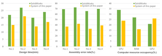 The cooperative enterprise of the project funded by this paper employs a third-party evaluation company to conduct software evaluation. Using a computer configured with 32 GB memory, a CPU of interi59400f, and graphics card of NVIDIA 2070 Super as the test platform, the time and assembly operation error rate of four professional evaluation personnel (No. 1–4) completing the intelligent design task of this chapter, using the intelligent design system of SolidWorks and this system are counted as the performance indicators of this system. Each professional completes the design step and assembly step five times (see Figure 22). We count the average operation time, assembly error rate, and computer resource consumption rate of each person; the results are shown in Figure 23.