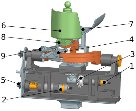 Notations used in Figure 2 represents: 1—motor for flexion–extension motion; 2—motor for radial–ulnar deviation motion; 3—bevel gears; 4—sledge pulleys; 5—belt transmission; 6—wrist support; 7—forearm support; 8—straight rail and sledge mechanism; 9—spherical joint.