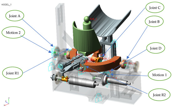 In the structure of the robot, there are rotational joints and upper rolling joints. In Figure 4, the kinematic joints defined in the ADAMS dynamic model are detailed, namely: