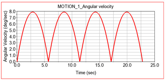 The law-of-motion time-history diagram is shown in Figure 5. The two parameters, the amplitude of motion and the time period, were chosen taking into account the similarity between the laws of motion in numerical simulation and those recommended by therapists for proper physical rehabilitation. The two laws of motion that will be assisted by the robot are named in MSC.ADAMS as MOTION_1 and MOTION_2. These movements are defined using the STEP function, as shown below.
