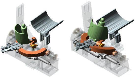 The mannequin-rehabilitation robot assembly is dynamically analyzed in MSC.ADAMS with the two modules of the ParReEx-wrist robot (flexion/extension and radial–ulnar motion) active simultaneously for a period of 22.8 s. Figure 6 presents the two extreme operating positions of the ParReEx robot corresponding to the combined flexion–extension and ulnar–radial movements.