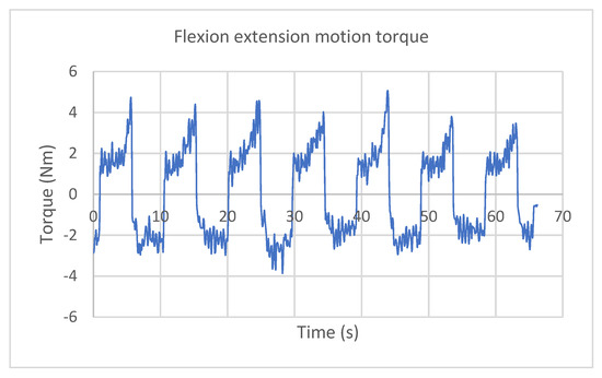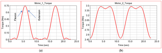 Analyzing the graph in Figure 7a computed for the flexion–extension motion, it is found that the maximum value of the actuation moment of this flexion/extension module is 0.7436 Nm, while the minimum value is near 0 Nm.