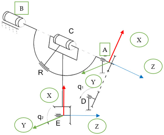 The ParReEx-wrist robotic system is designed for the rehabilitation of the wrist, namely flexion and extension of the wrist and ulnar and radial deviation of the wrist [49]. The robot has two degrees of freedom (DoF), one for each type of motion (Figure 1), namely: the revolute joint q1 to perform flexion–extension and the revolute joint q2 to perform radial–ulnar deviation. Each joint separately actuates a kinematic chain as follows: q1 actuates an RR chain consisting of the R1 and R3 revolute joints connected through link d around the OZ axis; q2 actuates link e around the OY axis, fixed between two bearings. Links d and e are connected via two revolute joints, namely R2 and R3, required to perform the circumduction motion (which is a combination of flexion–extension and ulnar–radial deviation motions). Notations used in Figure 1 represents: q1—flexion–extension motion; q2—radial–ulnar deviation motion; R1, R2, R3, R4—revolute joints; e, d—mechanism links.