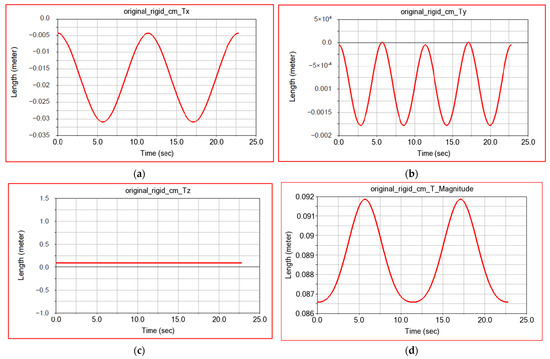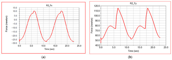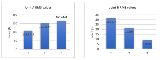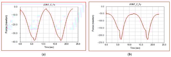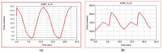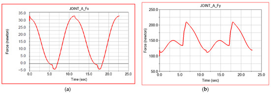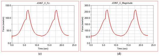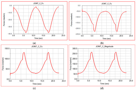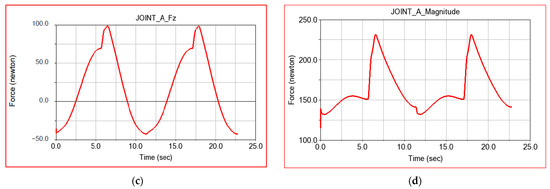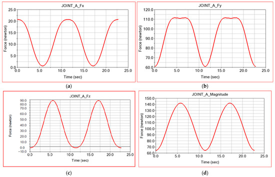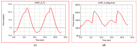 Graphs of time variation for the components of the connecting force in Joint A in relation to the local reference system attached to this joint are shown in Figure 9a–c. Analysis of these graphs shows that the maximum value recorded along the Y-axis of the local reference system in Joint A is 111.7138 N, and the minimum is 60.8693 N, with an RMS (round mean square) equal to 95.1698 N (Figure 9b). The component along the X-axis reaches an absolute maximum value of 20.8049 N, and the minimum value is equal to 0.6315 N, with an RMS of 13.9479 N (Figure 9a). The component along the Z-axis reaches 88.6393 N with an RMS of 49.6273 N (Figure 9c). The value of the resulting force in this joint has a maximum of 142.1042 N and a minimum of 64.3436 N according to Figure 9d.