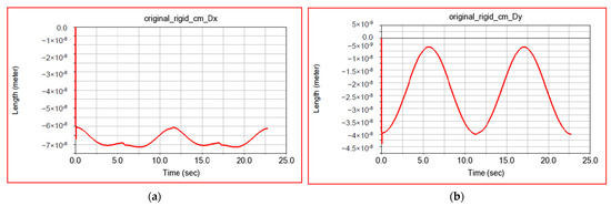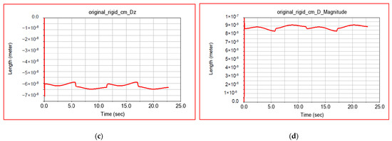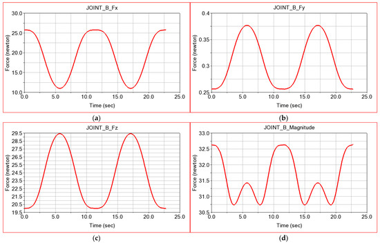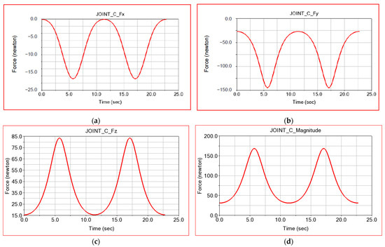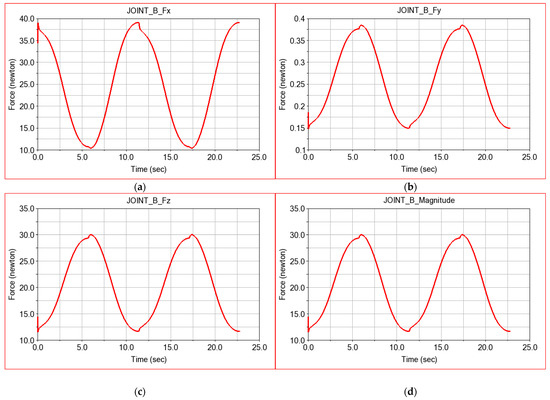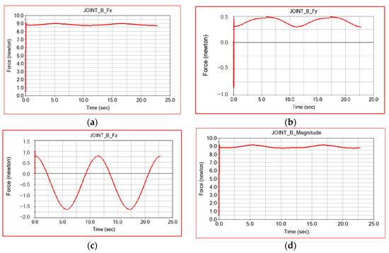 Graphs of time variation for the components of the connecting force in Joint B are shown in Figure 10a–c. The maximum value reported for the X-axis component is 25.8542 N, and the minimum is 11.002 N, with an RMS equal to 20.1699 N (Figure 10a). The Y-axis component has a maximum value equal to 0.3771 N, and the minimum value is equal to 0.2556 N, with an RMS of 0.3118 N (Figure 10b) The component along the Z-axis reaches 29.4384 N with an RMS of 24.3394 N (Figure 10c). The value of the resulting force in this joint reaches a maximum of about 32.6581 N, a minimum of 30.7333 N and an RMS equal to 31.6122 N, as we can see in Figure 10d.