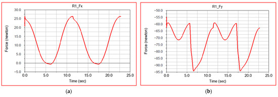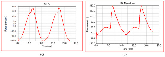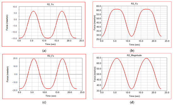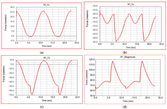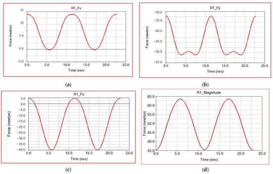Connecting forces in rotational Joint R1: (a) in the x-direction; (b) in the y-direction; (c) in the z-direction; and (d) the resultant.