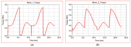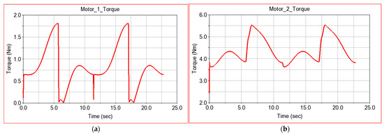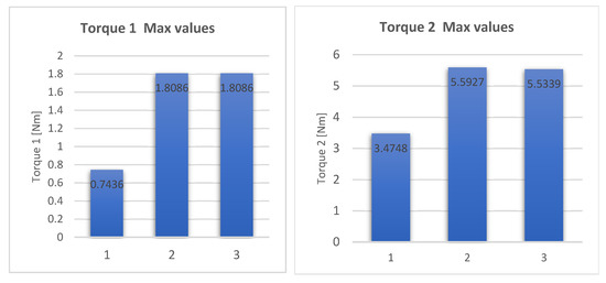 In the first phase, a dynamic simulation with the specified laws of motion and without considering the friction in the kinematic joints of the robot is performed. The results obtained for this simulation—meaning the variations of the motor torque calculated by numerical simulation in ADAMS when simultaneously performing both types of movement: flexion–extension and radial–ulnar motion of the wrist—are presented in Figure 7.