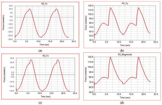 Connecting forces in rotational Joint R2 of the flexion/extension module: (a) in the x-direction; (b) in the y-direction; (c) in the z-direction; and (d) the resultant.