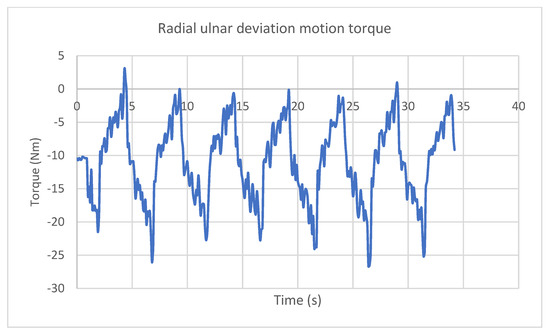 Numerical simulation in ADAMS (Figure 21) showed that flexion–extension motion of the wrist joint required a maximum moment of 1.8086 Nm, and radial–ulnar deviation required a maximum moment of 5.5339 Nm. Experimentally, higher values were obtained for these parameters: 4.5 Nm for flexion–extension and 20 Nm for radial–ulnar deviation. As a remark on the experimentally determined values, it is found that these quantities do not start from zero, so in the initial starting position, the system is preloaded by the human subject’s arm. The same happened in the numerical simulation in ADAMS, only in the simulation we considered the load produced by the patient’s arm of 30 N as a constant load.