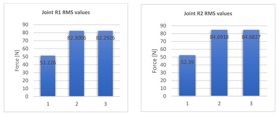 Evolution of the RMS values for the connection forces in Joints R1 and R2.