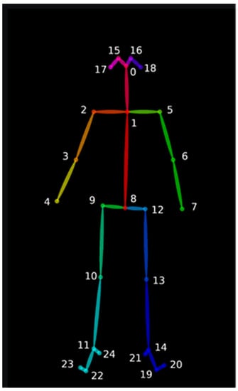 Twenty-five feature points were detected by OpenPose [17]. The points represent as follows: 0 is the nose; 1 is the neck; 2 is the right shoulder; 3 is the right elbow; 4 is the right wrist; 5 is the left shoulder; 6 is the left elbow; 7 is the left wrist; 8 is the middle hip; 9 is the right hip; 10 is the right knee; 11 is the right ankle, 12 is the left hip; 13 is the left knee; 14 is the left ankle; 15 is the right eye; 16 is the left eye; 17 is the right ear; 18 is the left ear; 19 is the left big toe; 20 is the left small toe; 21 is the left heel; 22 is the right big toe; 23 is the right small toe; 24 is the right heel.
