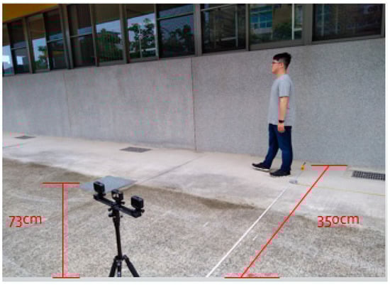 The equipment used in this experiment was a GoPro Hero5, which has 4K resolution and a built-in linear correction function. Therefore, the images obtained will not be distorted. First, we used the GoPro Hero5 camera to create a training video of the subject. As shown in Figure 3, we set up the tripod vertically at a distance of 3.5 m from the subject. After setting up the camera, we asked the subject to walk from the far right side of the camera screen to the left side. After walking to the left side, we continued to walk forward until the subject disappeared from the screen.