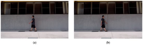 After the image was taken, we had to preprocess (video cleaning) the filmed video to ensure the final data were correct. First, because the film is a repeated video of the same behavior of walking to the left and walking to the right, and because there was a short period when the person disappeared during the two behaviors, the film had to be cut into several segments of varying length. The rules for these cuts were to divide the rightmost walk into the first category and the leftmost walk into the second category, and finally, to cut out the video of the time when the character disappears. After completing the above actions, two categories of different video lengths were obtained. Thus, twenty categories of films were obtained after the experiment with ten people. Since the turning part may be filmed during filming, we also cut out the turning part. In addition, the part that disappeared from the picture had to be cut out. Figure 4 shows that after the video was cleaned, everyone was divided into two categories: one with walking to the left and the other with walking to the right.