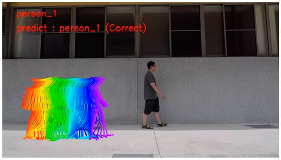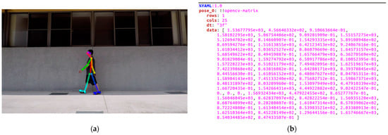 After that, we wanted to use the differences in each person’s walking style to make a judgment because we needed to perform body recognition, and OpenPose can extract the key points of the human body. Therefore, we used OpenPose to detect the skeleton in the above videos. Figure 5a shows the video of step 1 using OpenPose to capture the nodes. It can be seen that OpenPose can accurately capture the joints of the human body, which is very helpful for us in obtaining information about the human body. Figure 5b shows a keypoint type yml file for each frame. The yml file contains various information about the joints captured by OpenPose, showing the number of people on the screen and the locations of the human joints captured by OpenPose. The first number represents the x-coordinate of the numbered joints, the second number represents the y-coordinate of the numbered joints, and the third number represents the number of points. Since not all frames can catch the character, we deleted the frame if no critical points in the frame were caught.