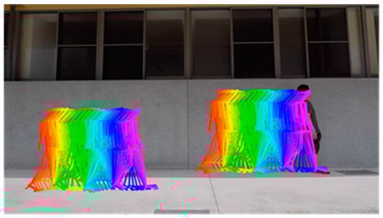 Figure 6 shows a schematic diagram of a group of data, where each color represents a frame of information, and we visualize 30 frames from 2 s with odd and even numbers. Therefore, each data group will have 30 lines of data, and each line represents a frame to capture the character’s joints. As a group of feature points has 25 coordinates, each coordinate has x and y values, so that each line has 50 numbers. In the end, there will be a total of 30 × 50 numbers in a set of data, making 1500 numbers in total.
