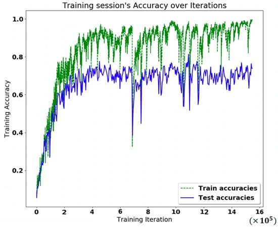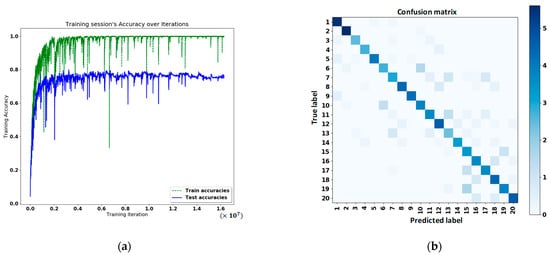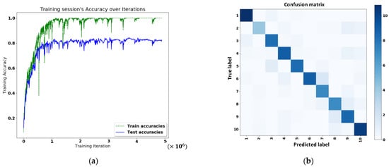 After deep learning, the training accuracy and classification results are shown in Figure 11a,b, respectively.