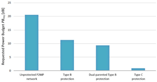 For the PB calculation, results for the P2MP WDM-PON protection schemes based on specific parameters’ values from Table 2 are presented in Figure 2. The highest power budget is determined for the unprotected P2MP network. The Type B protection satisfies requirements for correct evaluation of the power budget. For more protection, the dual-parented Type B or Type C protections can be adequately selected. These protection scenarios are suitable for rural geographical areas up to 33 km fiber length.