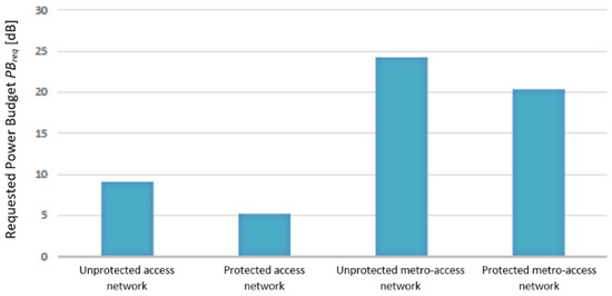For the PB calculation, results for the RING WDM-PON protection schemes based on specific parameters’ values from Table 2 and another adequate basic data selected for this topology type are presented in Figure 3. The 13 km fiber length is used for covering a metropolitan area with a higher number of users. The highest power budget must be assured for the unprotected metro-access network. However, the protected network architecture is more suitable because this architecture ensures the protection by means of the FF fiber redundancy, whereby no system breakdown influencing a high number of users is occurring in a case of the fiber failure.