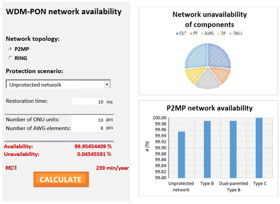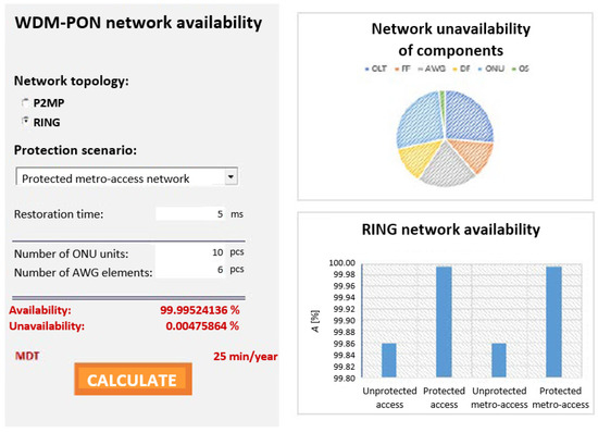 Next, the main screen with modified parameters of the RING WDM-PON protection scheme for the protected metro-access network scenario—a ring topology, a protected metro-access network—is displayed (Figure 5). Furthermore, parameters—the restoration time 5 ms and a number of AWG elements is 6—are setting up. After pressing the button CALCULATE, results for the network availability and unavailability and the MDT time are re-calculated and a graph of the network unavailability of components is automatically changed. The change is also expressed by a WDM-PON architecture for the selected protection scenario.