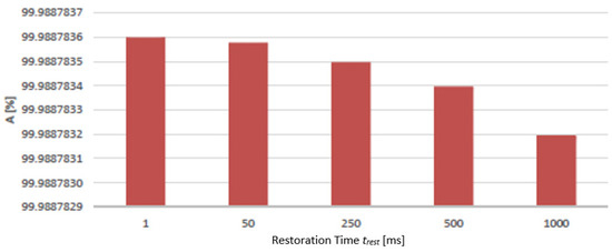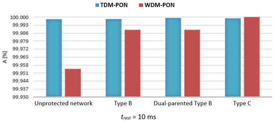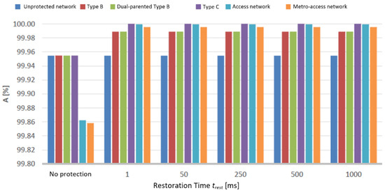 The network availability of P2MP WDM-PON protection schemes achieves different values for different protection scenarios. The highest network availability is reached by the Type C protection. Other protection scenarios—Type B and Dual-parented Type B—reach similar results. In Figure 7, the network availability of the dual-parented Type B protection is presented for various protection times from Table 4. As can be seen, this network availability is decreasing with higher restoration times.